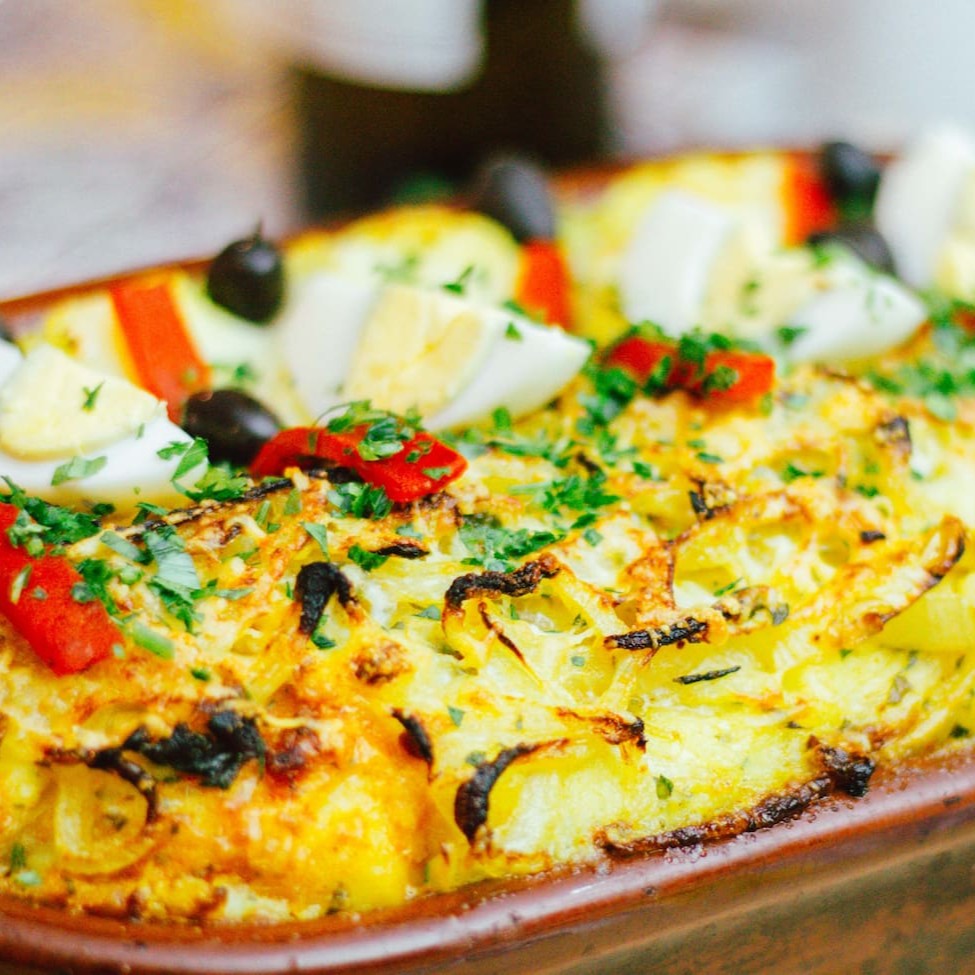 Bacalhau aos nacos com batatas, pimentões, cebola, ovos, azeitonas portuguesas, temperado com ervas, colorau espanhol, molho de tomate e azeite. Tudo gratinado ao forno.