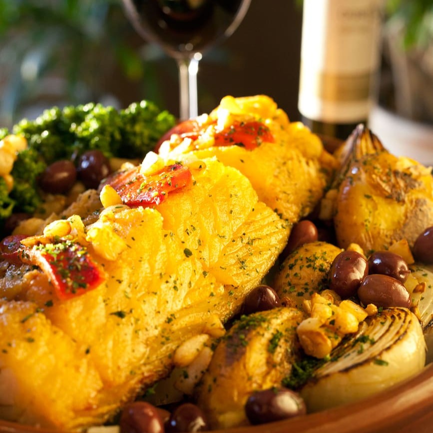 Bacalhau em posta, batatas cozidas, alho, cebolas, pimentão, azeitonas portuguesas e tomate. Tudo no azeite gratinado ao forno.