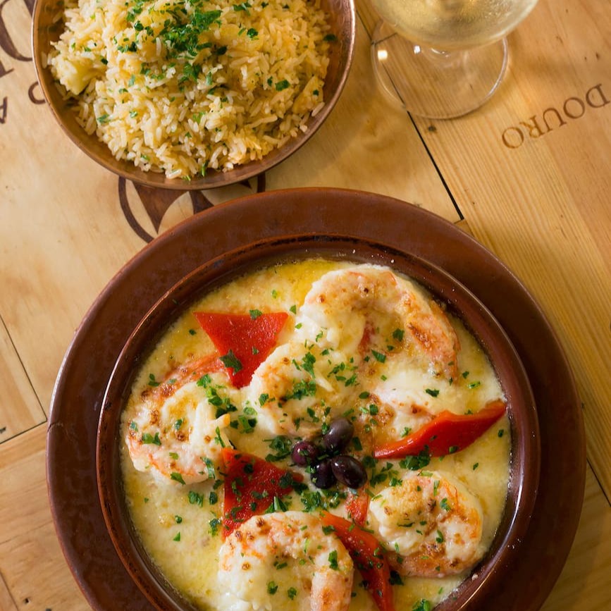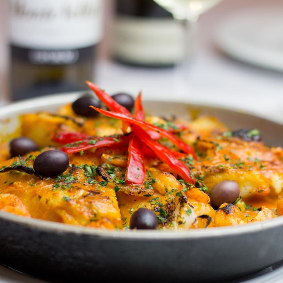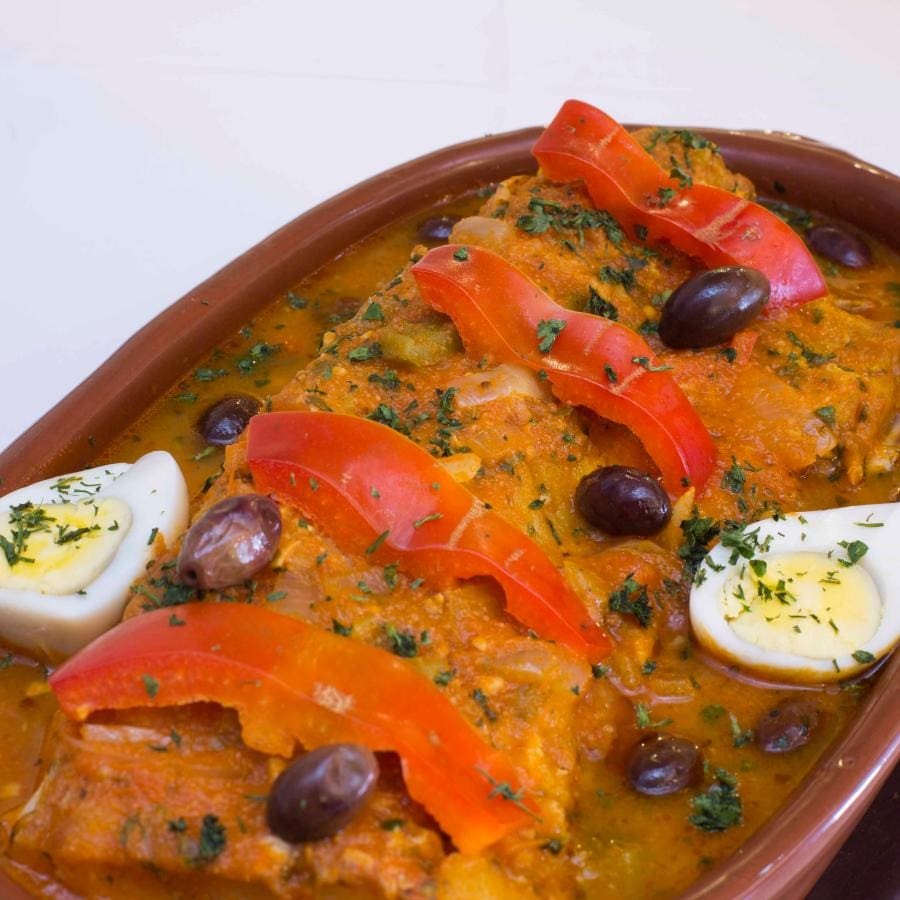 Bacalhau em nacos e camarões, com alho picado, cebolas em pétalas, pimentões, azeite, molho de tomates, leite de coco, azeitonas portuguesas, e pimenta dedo de moça.