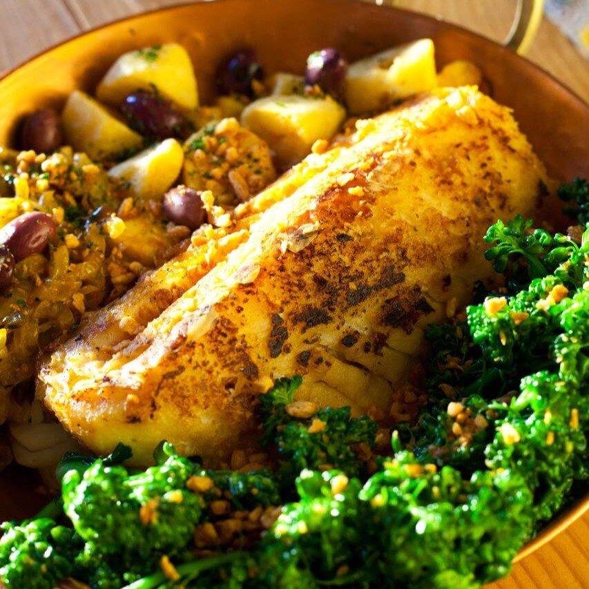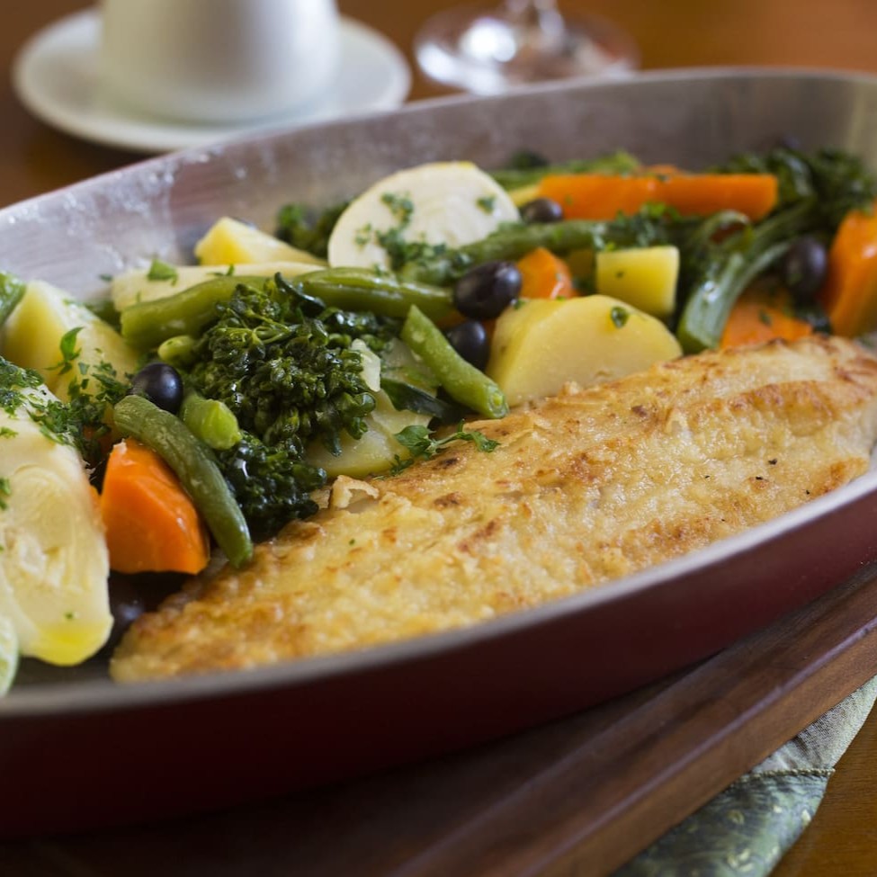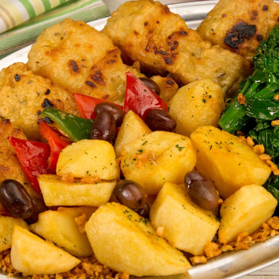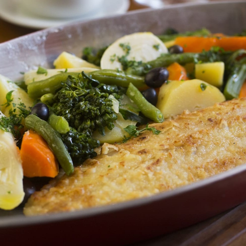 Filet de bacalhau à doré com brócolis, batatas cozidas, azeitonas portuguesas e alho frito.