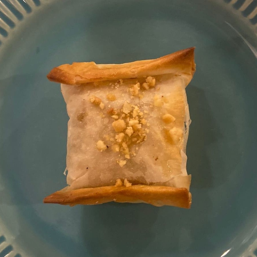 Massa folhada, com recheio a base de ovos, nozes e amêndoas.