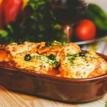 Posta gratinada ao forno, com molho de tomate, cebola, batatas, ovos, pimentões e azeitonas portuguesas.