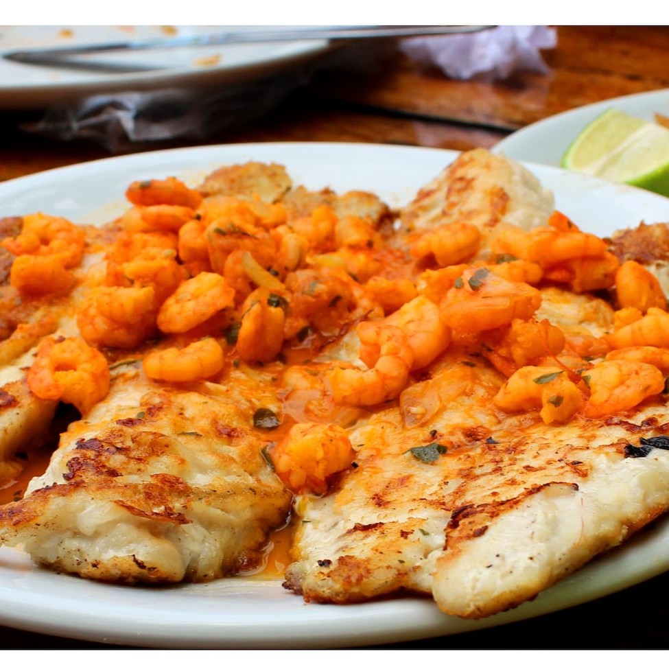 À dorê, coberto por molho de tomate caseiro e camarões. Acompanha arroz branco e purê de batatas.