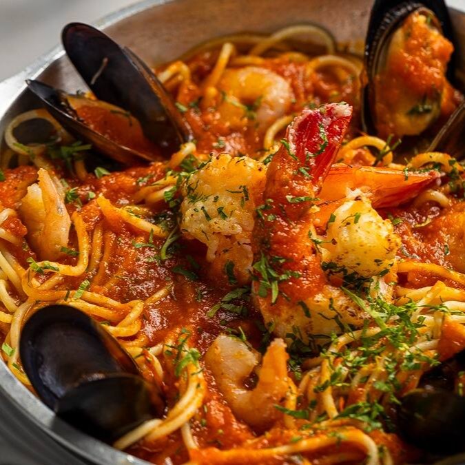 Espaguete ao molho vermelho com camarões, lulas, polvo, e mariscos.