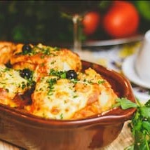 Posta inteira cozida, com batatas cozidas, cebola, ovos cozidos, azeitonas portuguesas, cobertura de purê. Tudo gratinado ao forno.