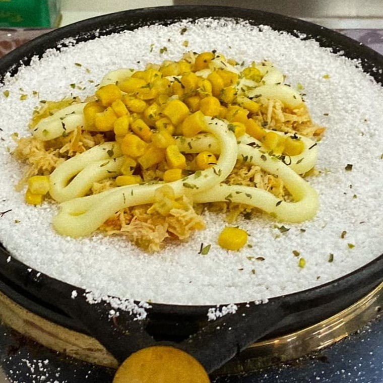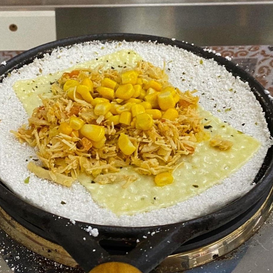 Frango desfiado e temperado com molho especial a base de tomate e cebola + Milho