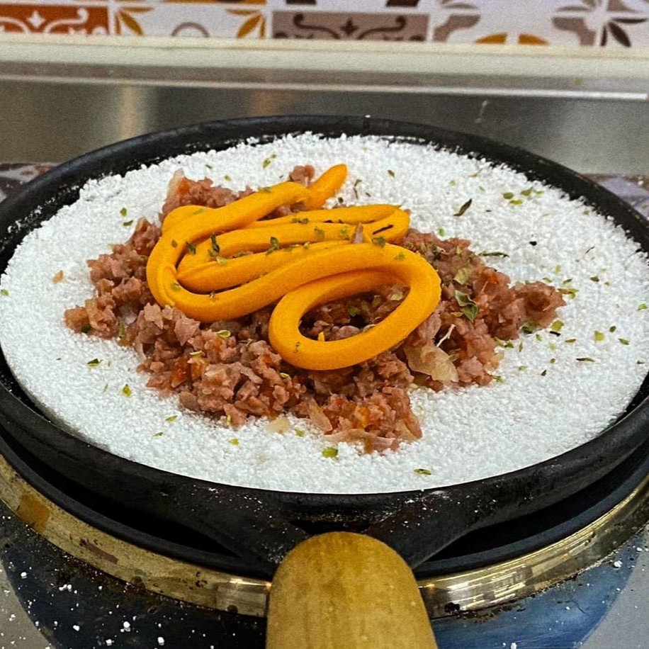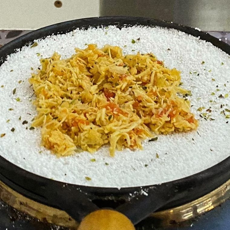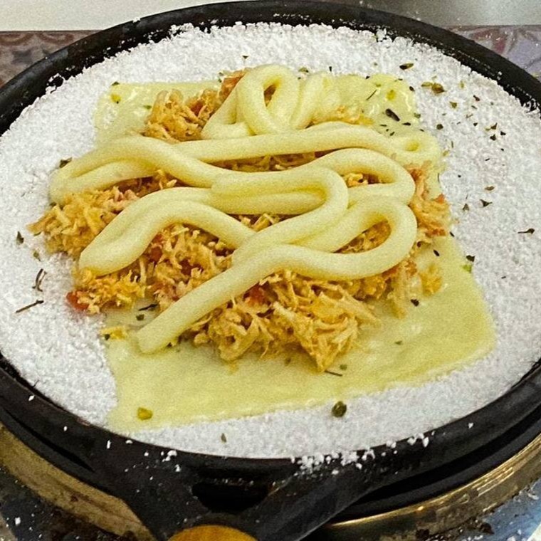 Frango desfiado e temperado com molho especial a base de tomate e cebola