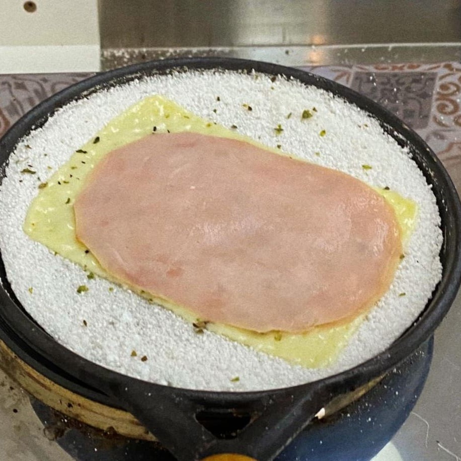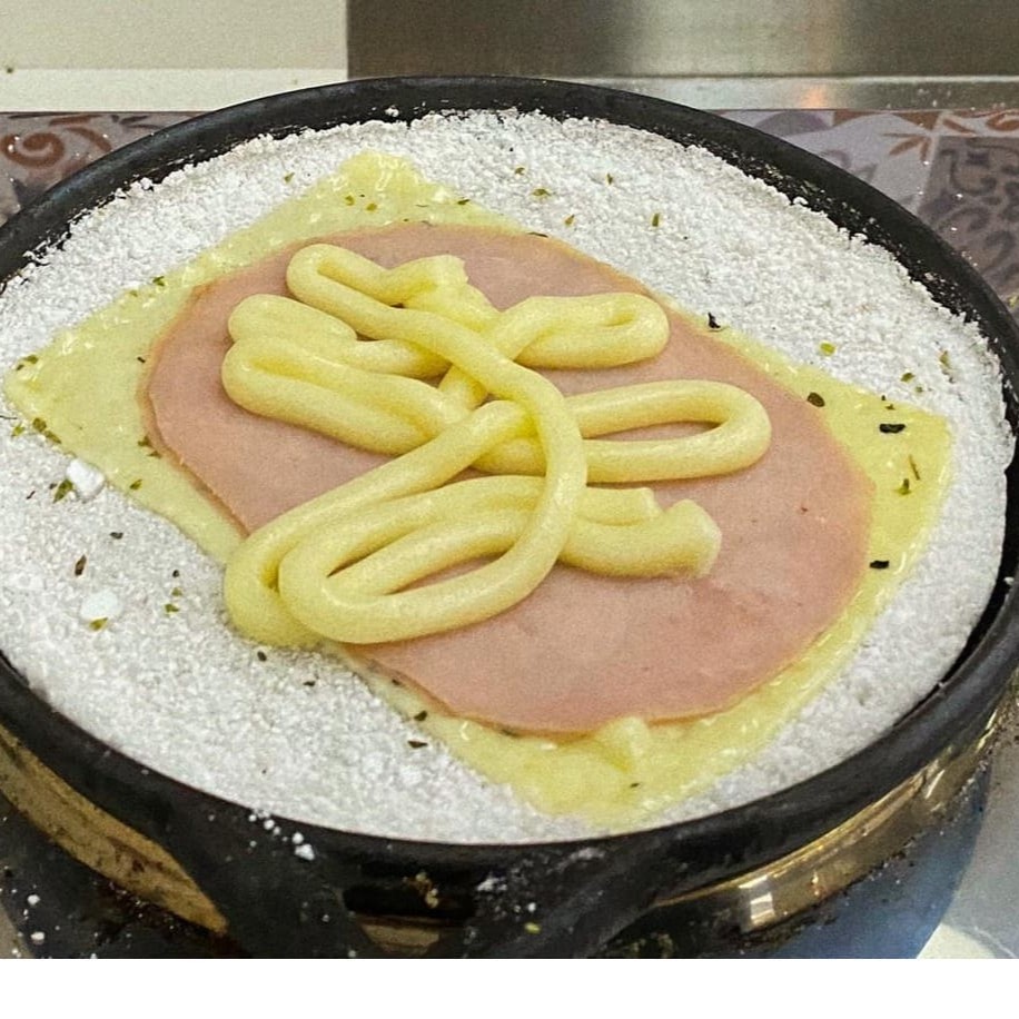 Peito de Peru fatiado, Mussarela fatiada, Requeijão, temperado com azeite, sal e orégano