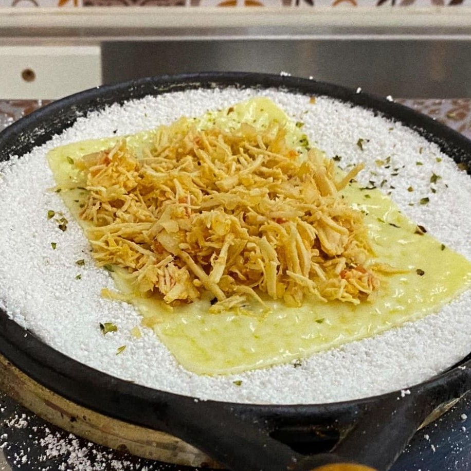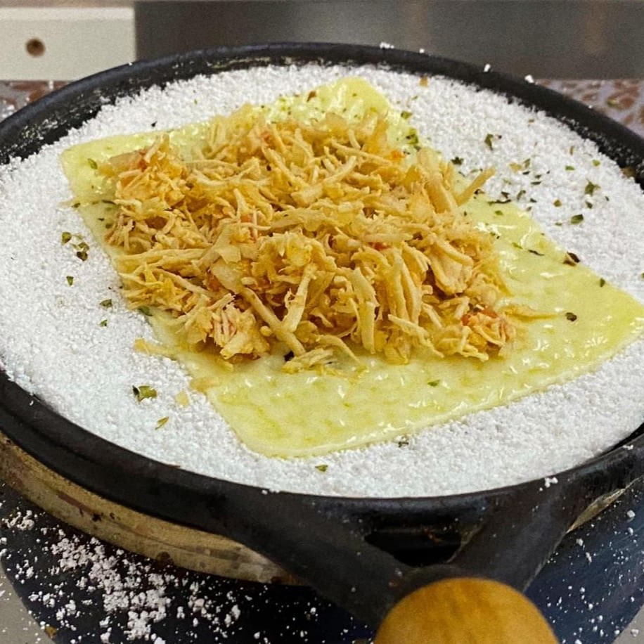 Frango desfiado e temperado com molho especial a base de tomate e cebola + Queijo branco frescal