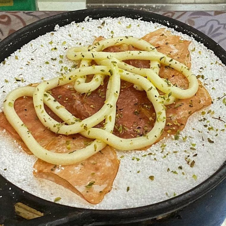 Salame fatiado, Mussarela fatiada, temperado com azeite extra virgem e uma pitada de orégano