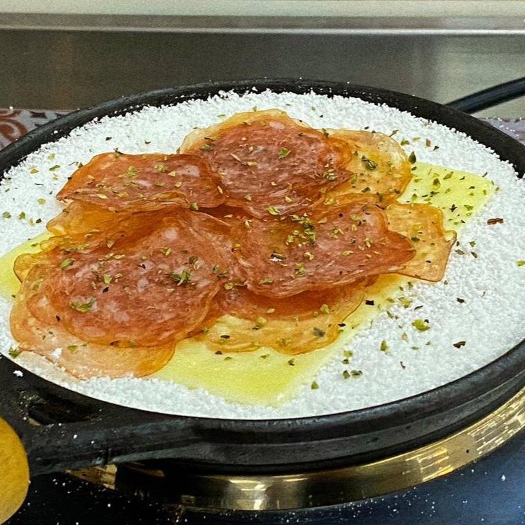 Salame fatiado, temperado com azeite extra virgem e uma pitada de orégano