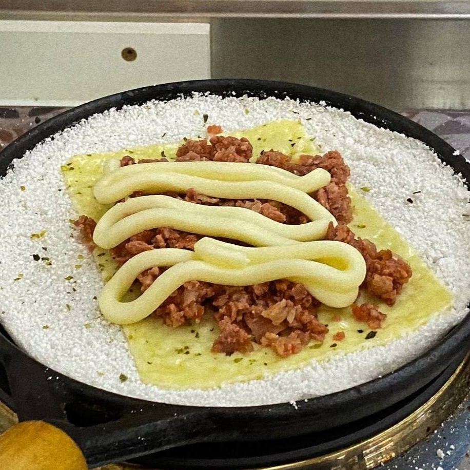 Calabresa Sadia triturada e temperada com molho especial a base de tomate e cebola + Mussarela fatiada