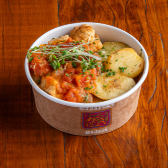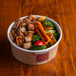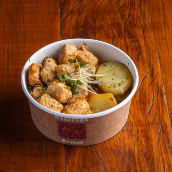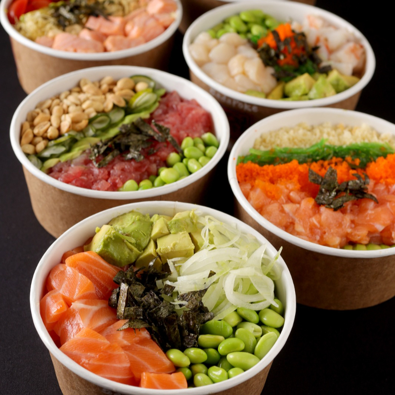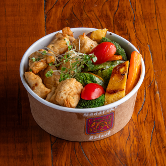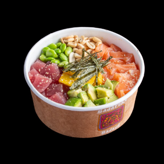 Base de arroz japonês temperado. Acompanha Salmão e Atum, avocado, edamame, manga e Amendoim. Finalizado com Nori e Gergelim torrado. Molho BadaPoke (a base de óleo de gergelim, shoyu e gengibre, levemente apimentado)