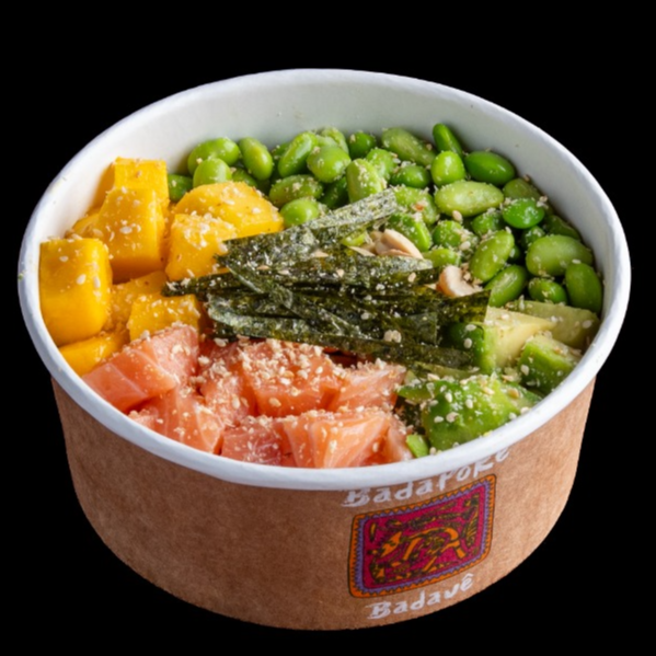 Com base de arroz japonês temperado. Acompanha salmão, edamame, avocado, manga e amendoim torrado. Finalizado com nori e gergelim torrado. Acompanha Molho BadaPoke (a base de óleo de gergelim, shoyu e gengibre, levemente apimentado)