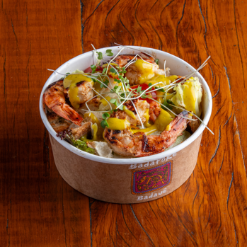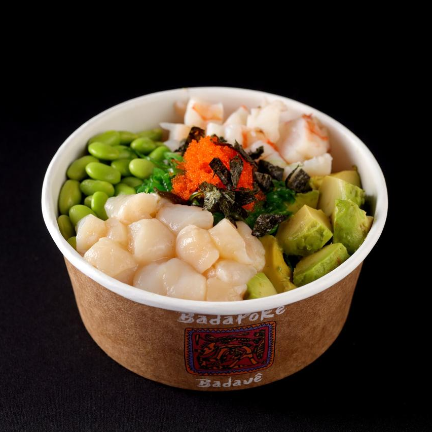 Com base de arroz japonês temperado. Acompanha Camarão e Vieira, avocado, Wakame, ovas Massago e edamame. Finalizado com nori e gergelim torrado. Acompanha Molho BadaPoke (a base de óleo de gergelim, shoyu e gengibre, levemente apimentado)