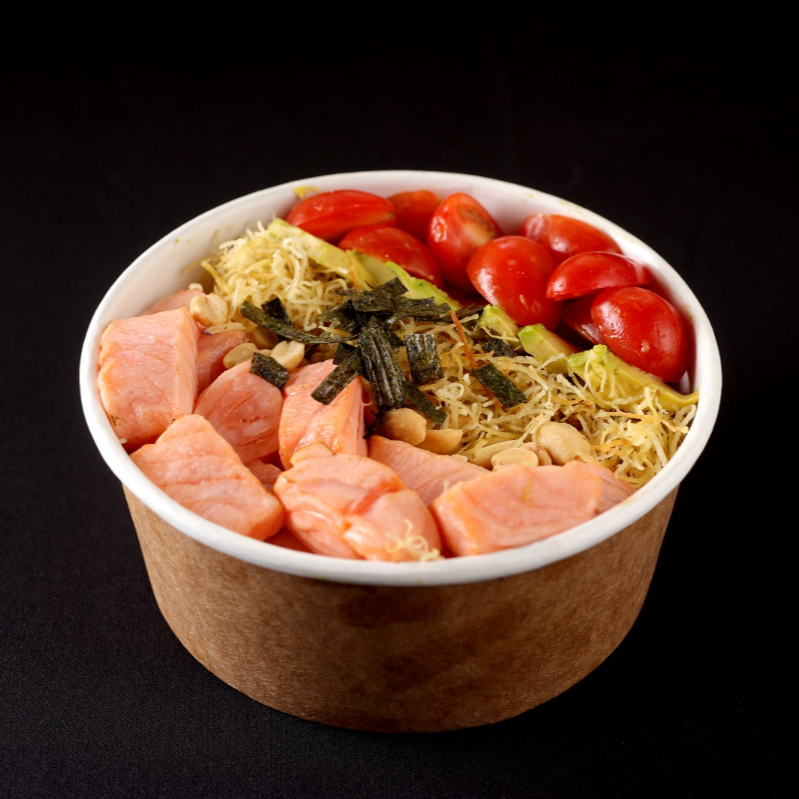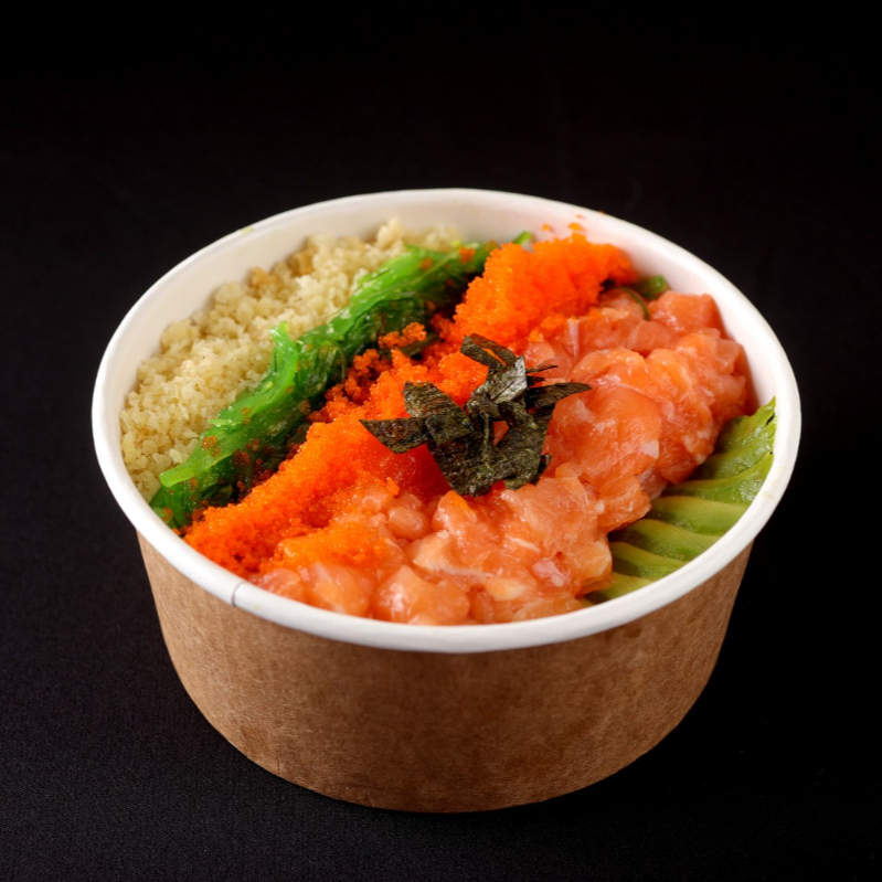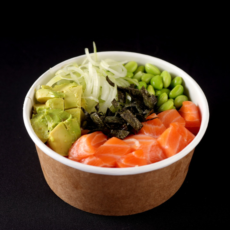 Com base de arroz japonês temperado. Acompanha salmão em cubos, pepino ralado, edamame e avocado. Finalizado com nori e gergelim torrado. Acompanha molho BadaPoke (a base de óleo de gergelim, shoyu e gengibre, levemente apimentado).