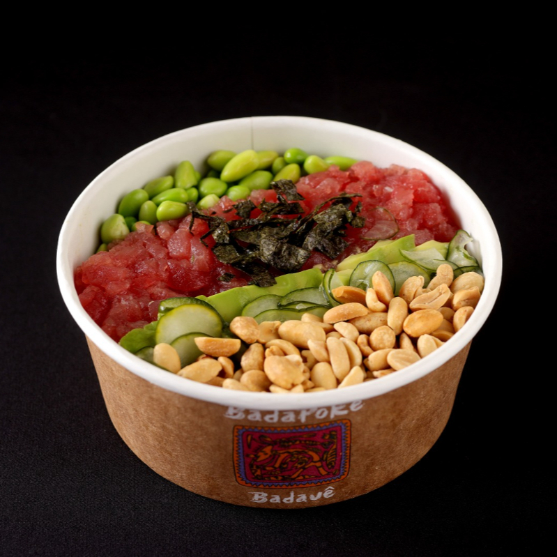 Com base de arroz japonês temperado. Acompanha tartare spicy tuna, avocado, Sunomono, edamame e amendoim. Finalizado com nori e gergelim torrado. Acompanha Molho BadaPoke (a base de óleo de gergelim, shoyu e gengibre, levemente apimentado).