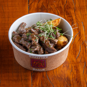 Tiras de mignon molho roti + arroz com brócolis + batata rústica