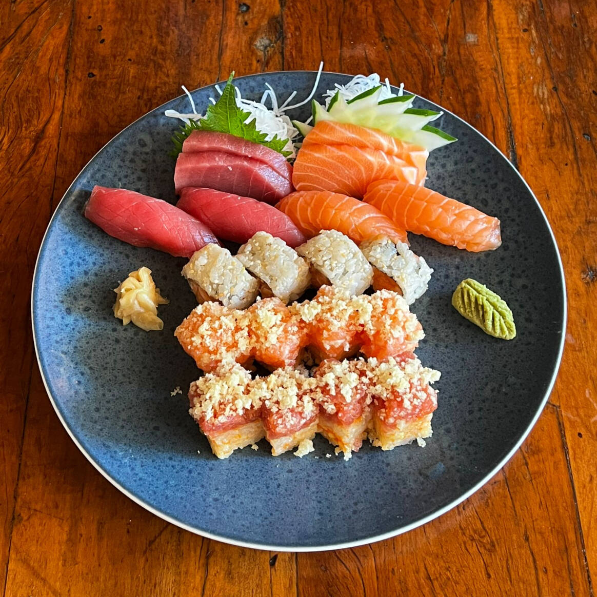 2 sashimi de salmão, 2 sashimi de atum, 2 Niguiri atum, 2 niguiri salmão, 4 uramaki salmão, 4 - batera salmão, 4 batera de atum spicy