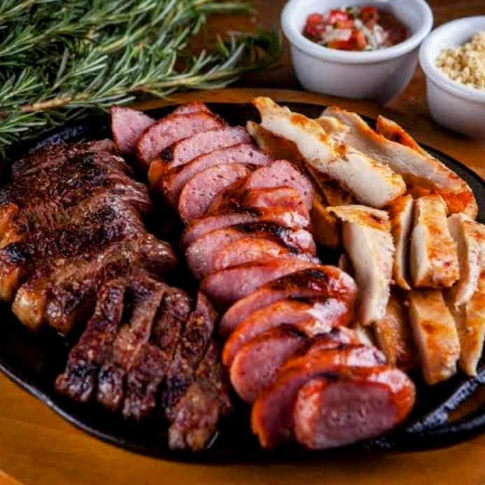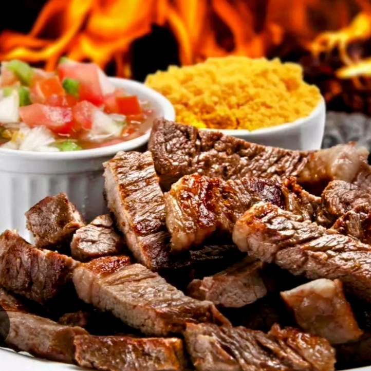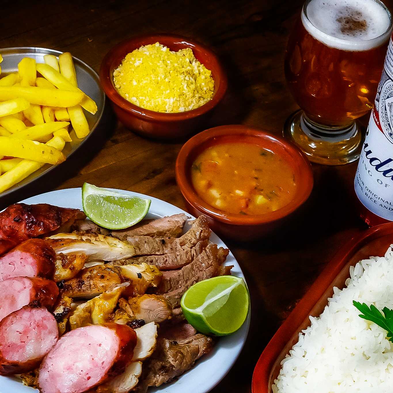 Saboroso churrasco misto, acompanha arroz fresquinho, delicioso feijão, alcatra assada na brasa, filé de coxa, linguiça Toscana, farofinha, vinagrete e fritas.