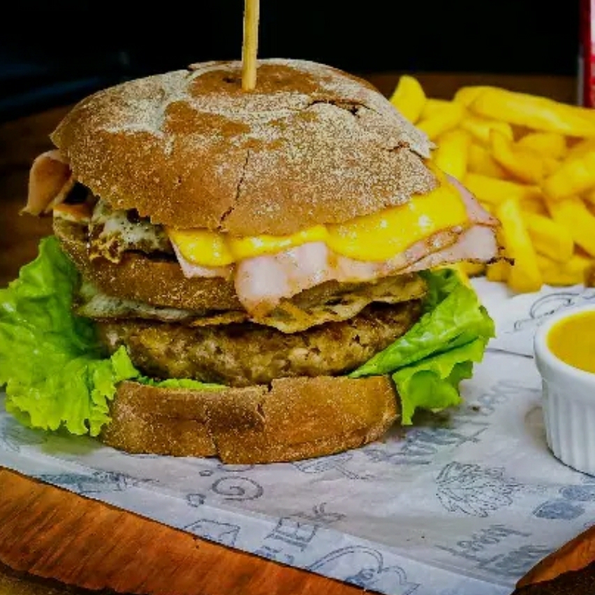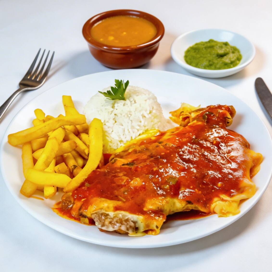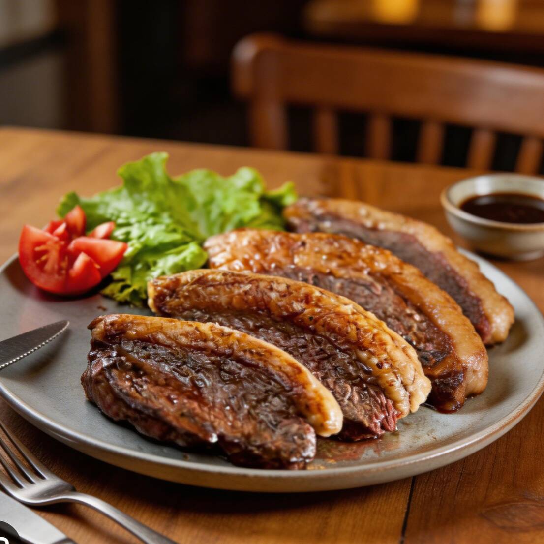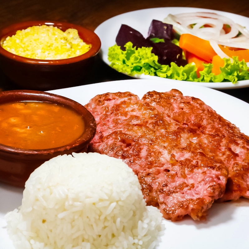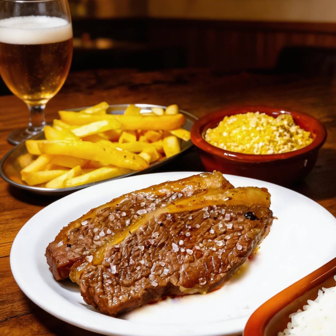 Desfrute de uma saborosa carne bovina de Contra Filé, cuidadosamente assada na brasa, que traz ao paladar a autêntica experiência de um churrasco. Nosso prato é abundantemente servido com acompanhamentos tradicionais: um arroz soltinho, um feijão caseiro, uma farofa crocante, um vinagrete fresco e batatas fritas douradas e crocantes.