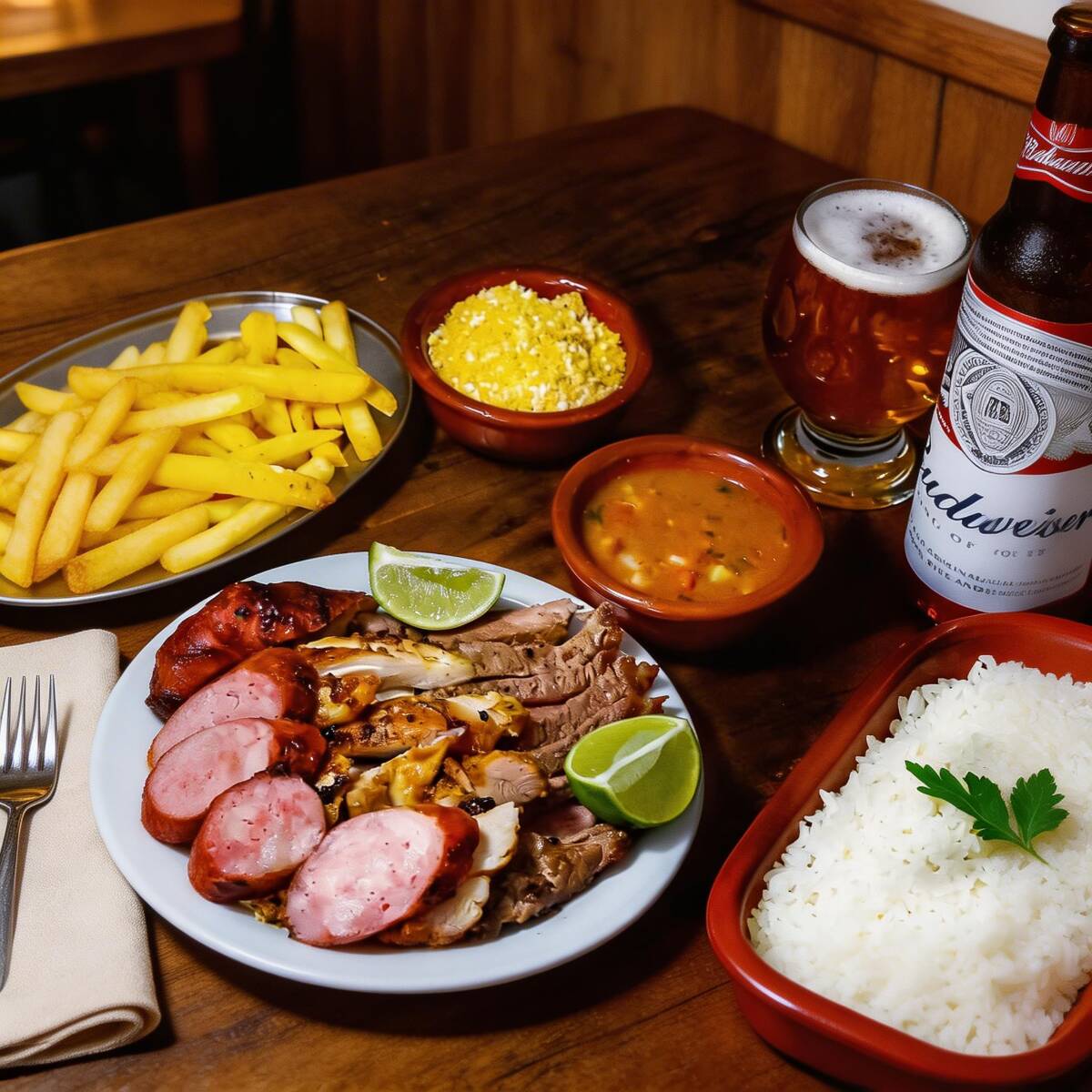 Descubra a delícia do nosso 'Combo com a estrela principal, a 'Chuleta Família Este prato é composto por 4 chuletas generosas, cuidadosamente assadas na brasa, exalando um aroma irresistível e um sabor incomparável. Acompanha um arroz branco fresquinho, bem soltinho, um feijão caseiro, absolutamente delicioso , batata frita , farofinha e vinagrete