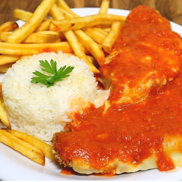 À Parmegiana de Filé de Frango Acompanha: arroz, feijão, filé de frango crocante coberto com mussarela e um delicioso molho de tomate caseiro, fritas e salada.