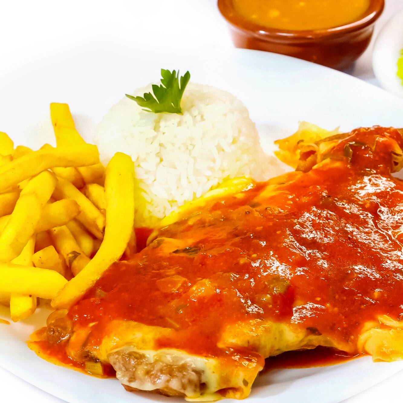 Nossa Deliciosa À Parmegiana de Alcatra Acompanha : arroz, feijão, Alcatra crocante coberto com mussarela e um delicioso molho de tomate caseiro, salada e fritas.