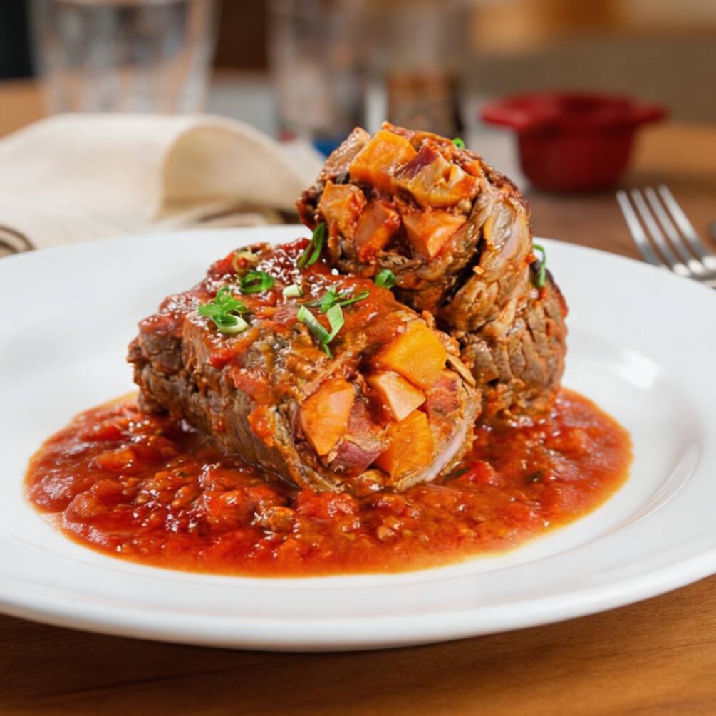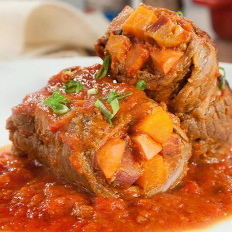 Um sabor maravilhoso do bife a rolê Acompanha: arroz, feijão, purê de batata, farofa e salada