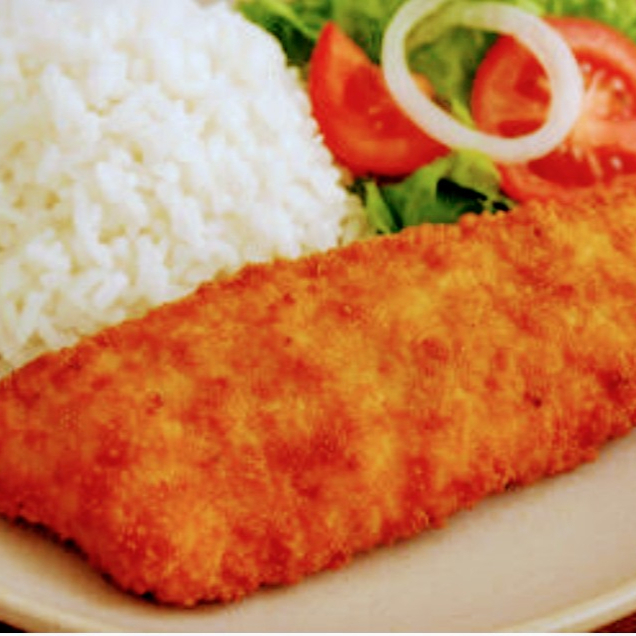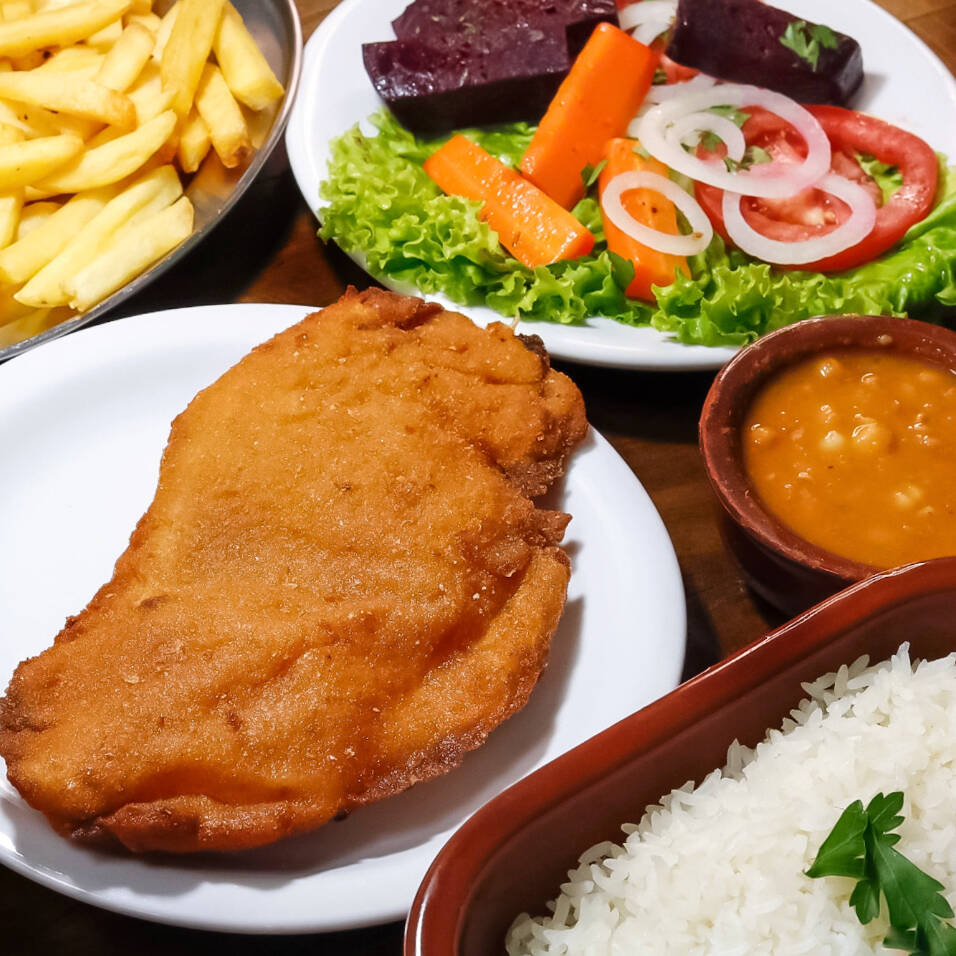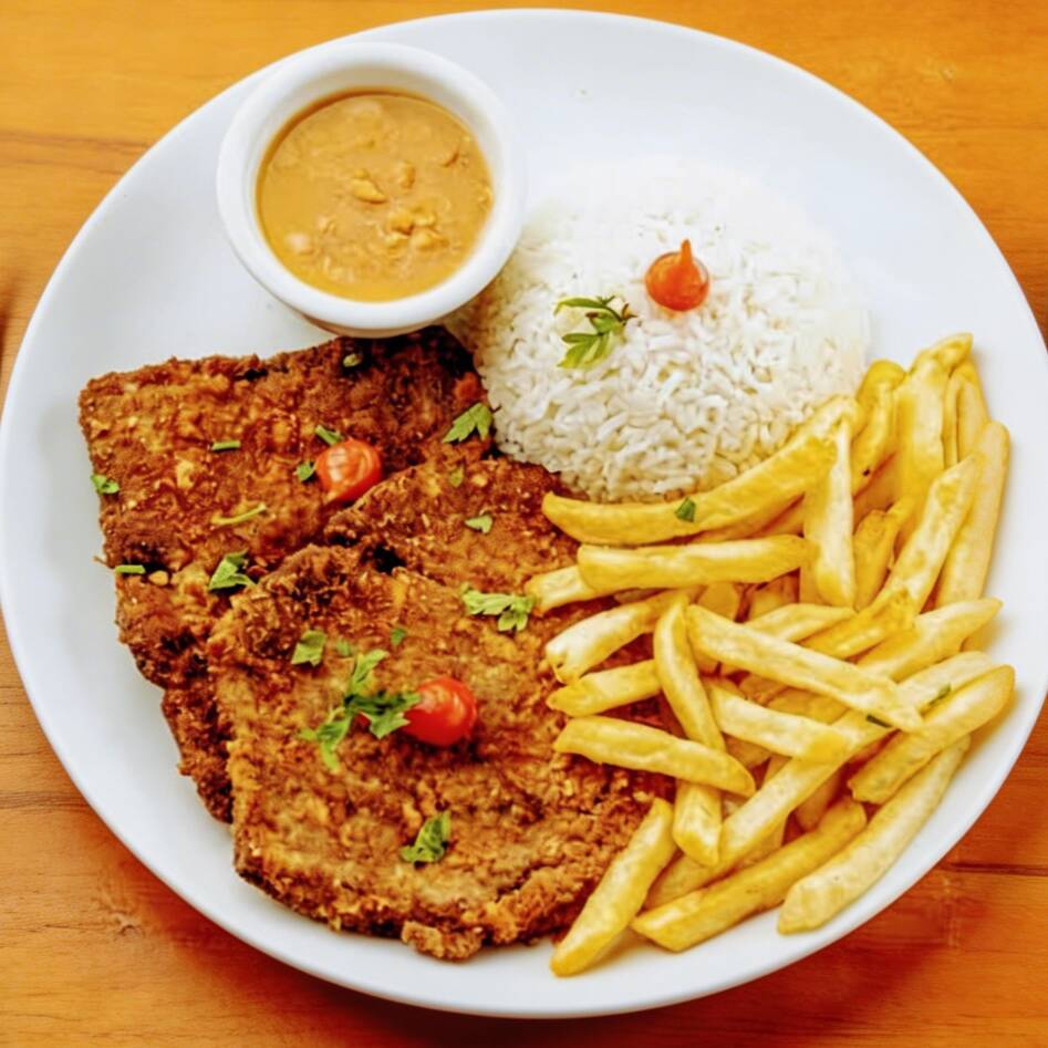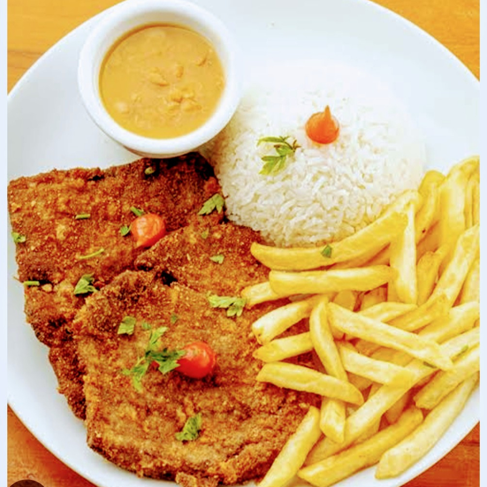Delicioso filé de frango crocante Acompanha arroz, feijão, fritas e salada.