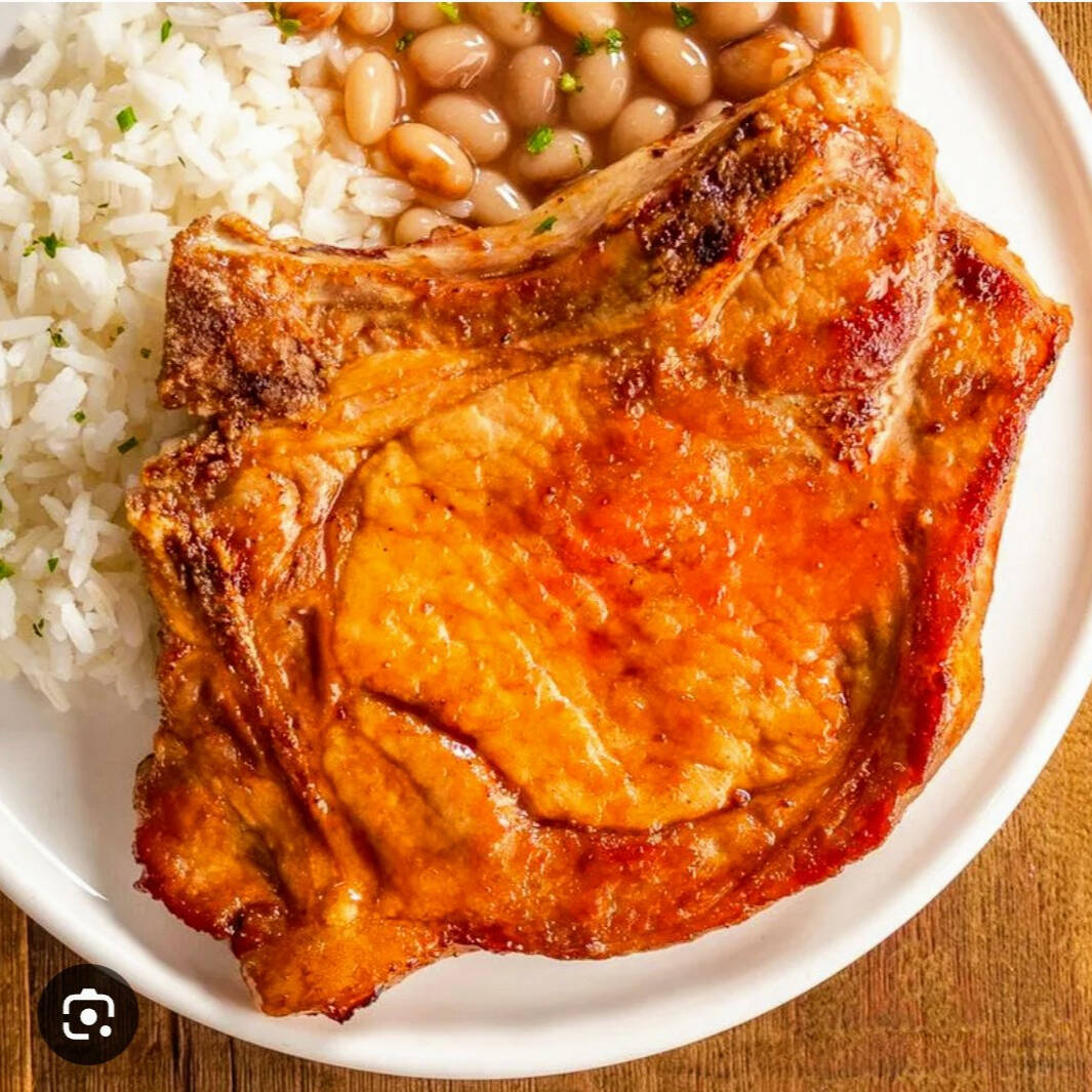 Delicie-se com a nossa suculenta Bisteca Suína, meticulosamente preparada para preservar todos os seus sucos naturais. Esta estrela principal é acompanhada de um arroz branco leve e saboroso, feijão fresco e cremoso, uma farofa crocante e uma salada fresca e nutritiva.