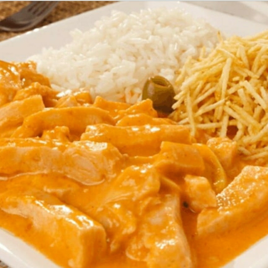 Saboreie nosso inigualável Strogonoff de Frango. Este prato é cuidadosamente preparado com suculentos pedaços de frango, envolvidos em um molho cremoso e único. Acompanhado de um arroz soltinho e aromático, feijão cozido à perfeição, batata palha crocante e uma irresistível salada fresca.