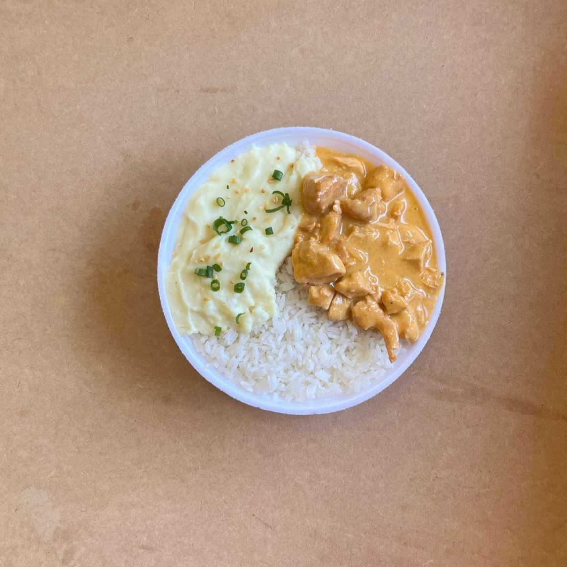 Marmita com delicioso filé de frango ao molho estrogonofe acompanhado de arroz branco e purê de batatas inglesas. Marmita indicada para 01 pessoa.