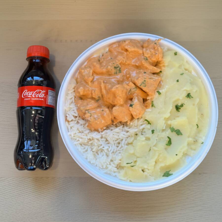 Marmita com delicioso filé de frango ao molho estrogonofe acompanhado de arroz branco e purê de batatas inglesas. Acompanha refrigerante pet Coca Cola bem gelado. Marmita indicada para 01 pessoa.