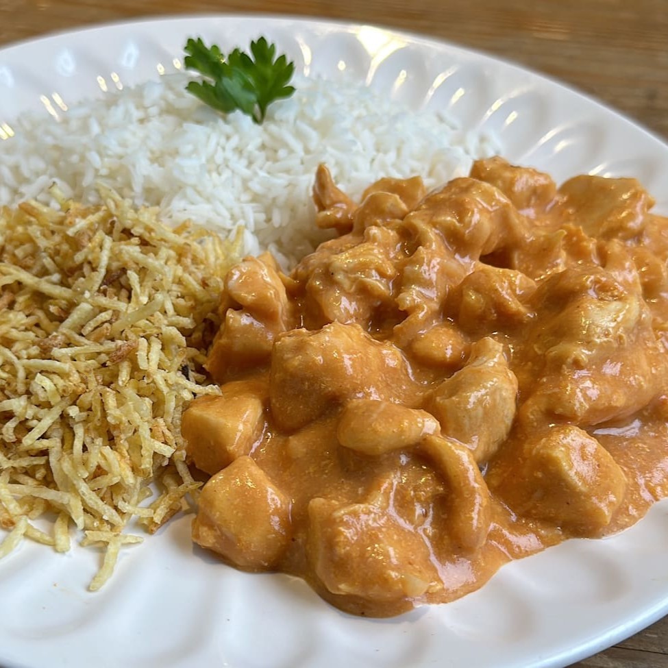 Estrogonofe de frango cremoso, servido com arroz branquinho e batata palha crocante. Um favorito de todos!