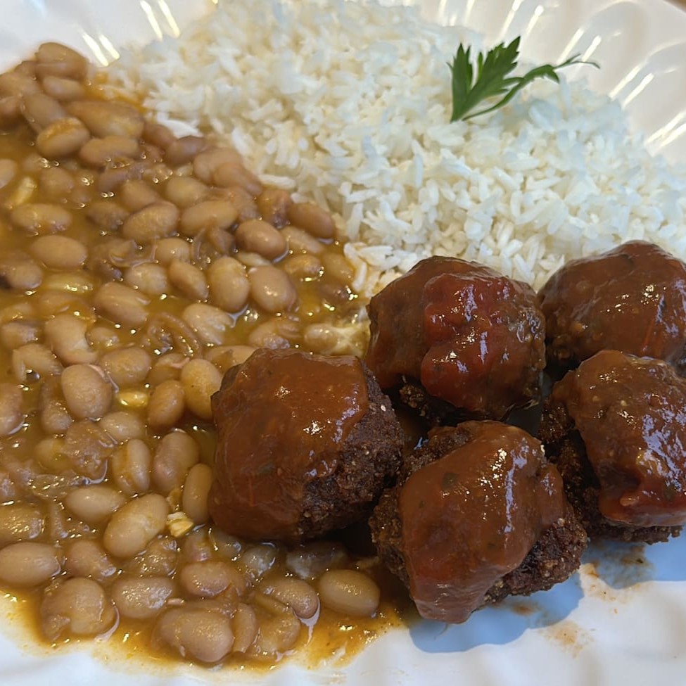 Deliciosas almôndegas bovina ao molho de tomates frescos ao sugo. Acompanha Arroz branco feijão