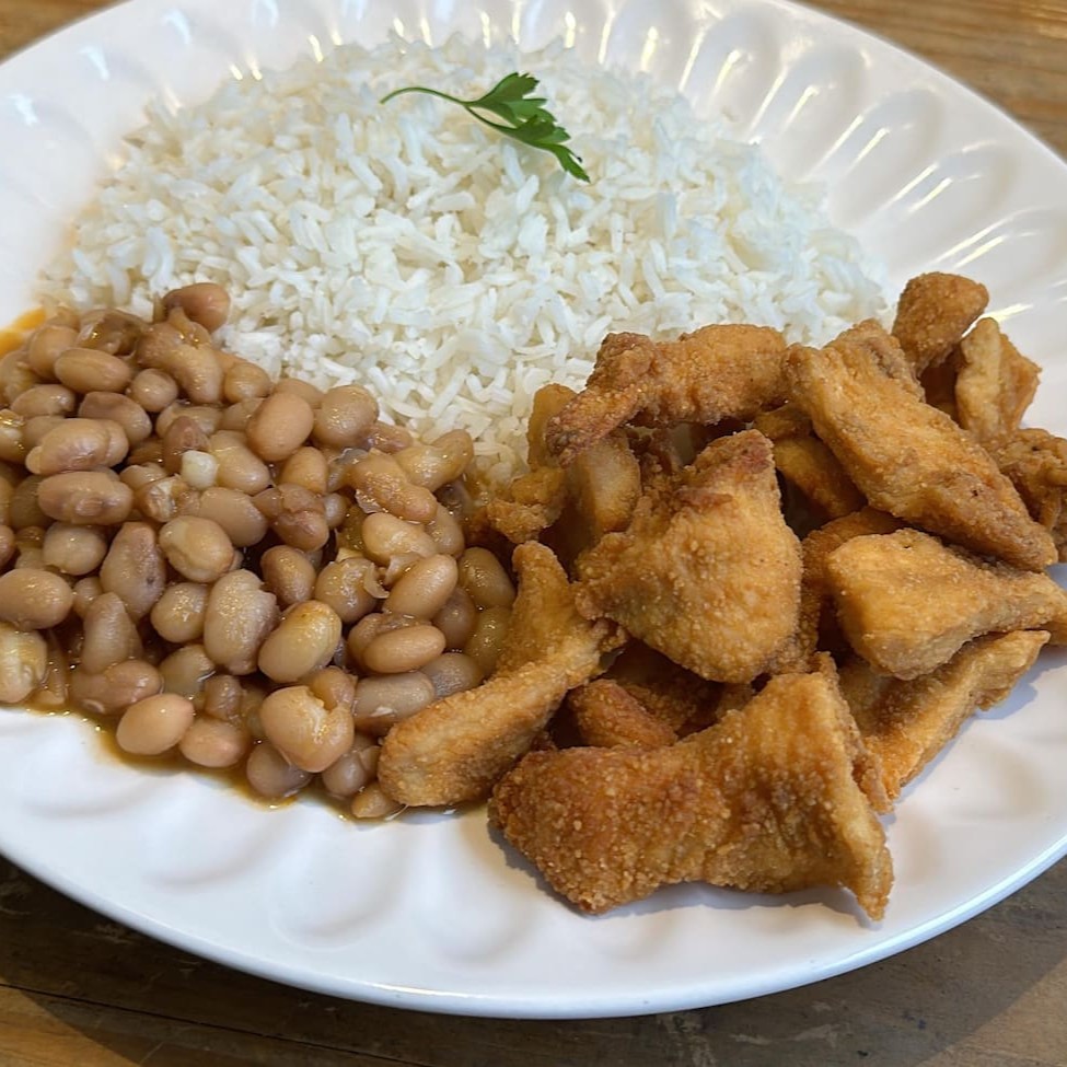 Delicioso Frango em cubos empanado com farinha especial . Acompanha: Arroz Branco e feijão