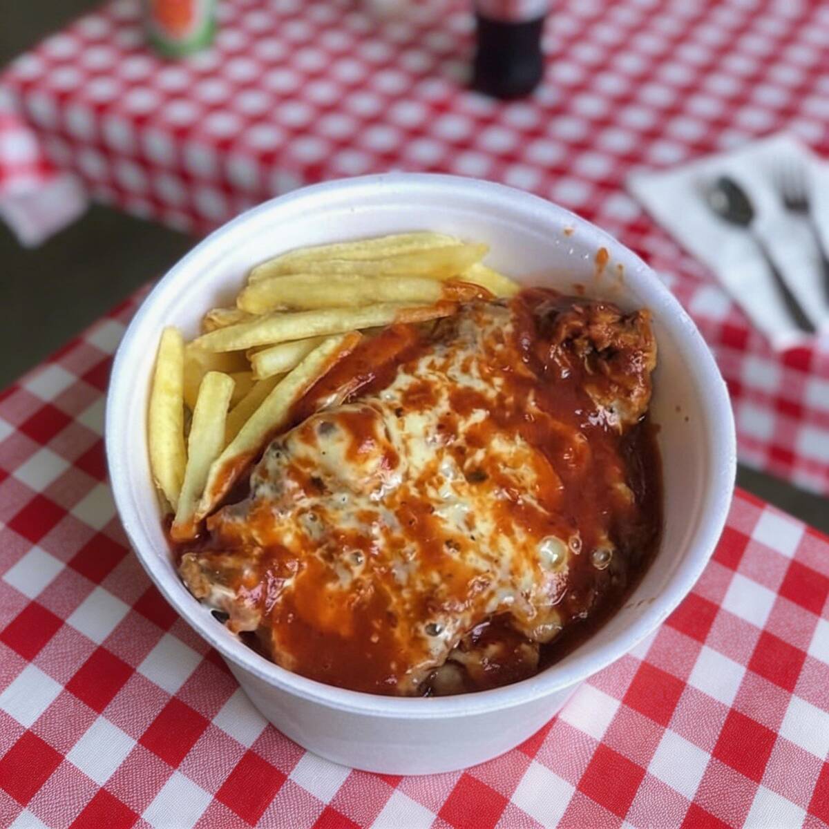 Empanado e frito, coberto com um delicioso molho de tomate temperado , mais queijo muçrela. Acompanha; arroz branco, um delicioso feijão com o tempero do chef e batata frita. Todos os itens são embalados separadamente e selados na hora. Todas as nossas embalagens são recicláveis, por favor preocupe-se você também com o meio ambiente.