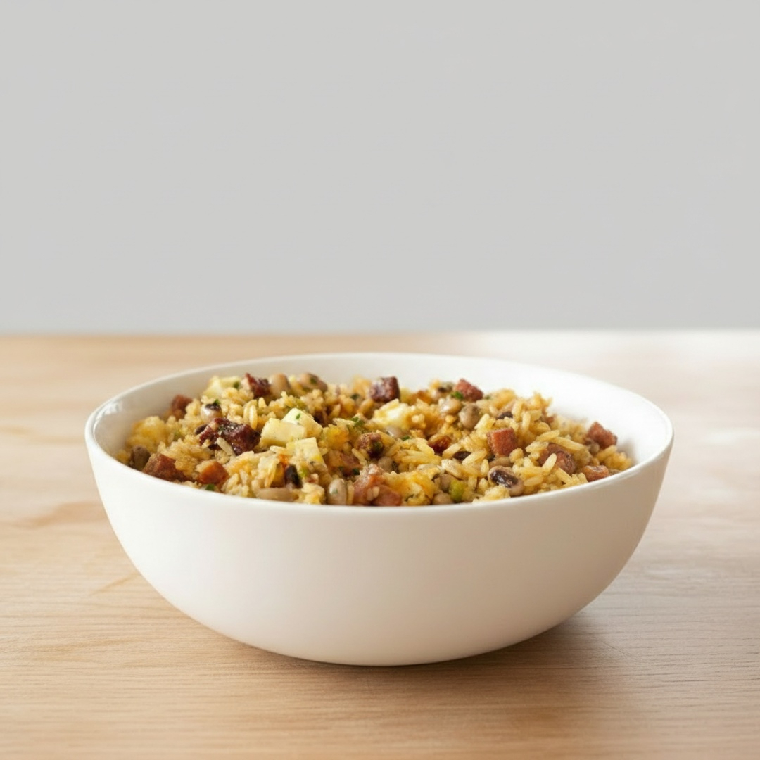 Nosso Baião de dois é tradicional da região Nordeste do Brasil. Preparado com Arroz e Feijão fradinho cozidos com cebola , calabresa e bacon refogados adicionados e especiarias. O Chef finaliza finamente a mistura com Mini Cubos Crocantes de Queijo Coalho Frito e macaxeira frita. É de cair o queixo!