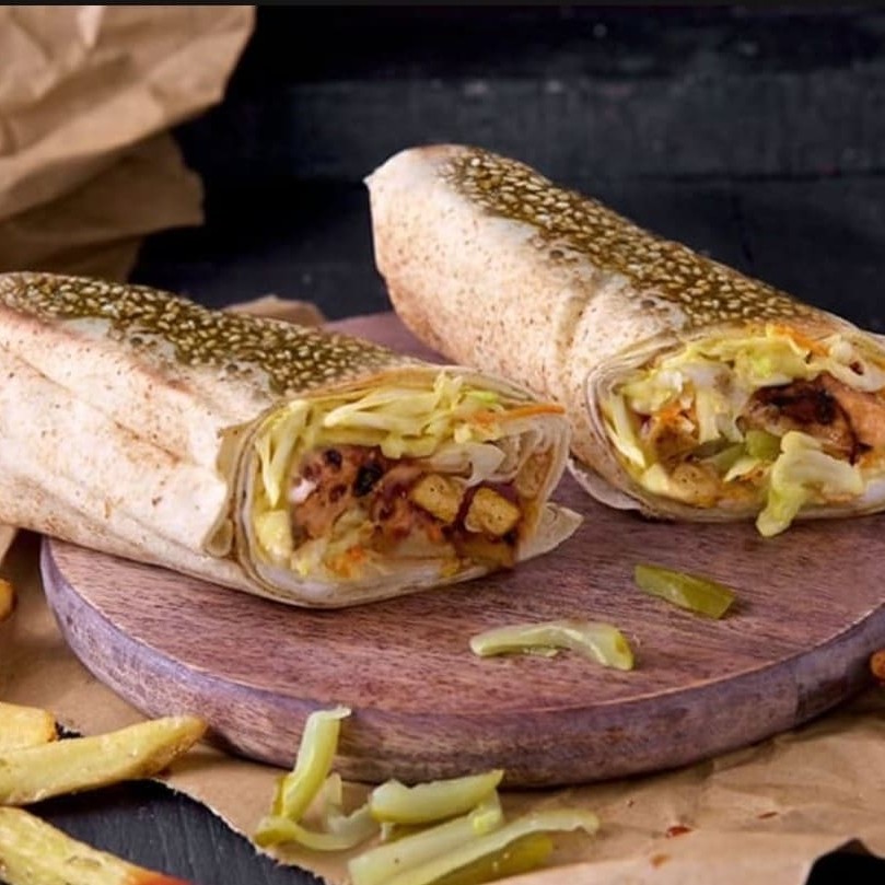 frango em tiras temperado a moda arabe com picles, tomate e molho de alho, enrolado no pão sirio. Acompanha fritas