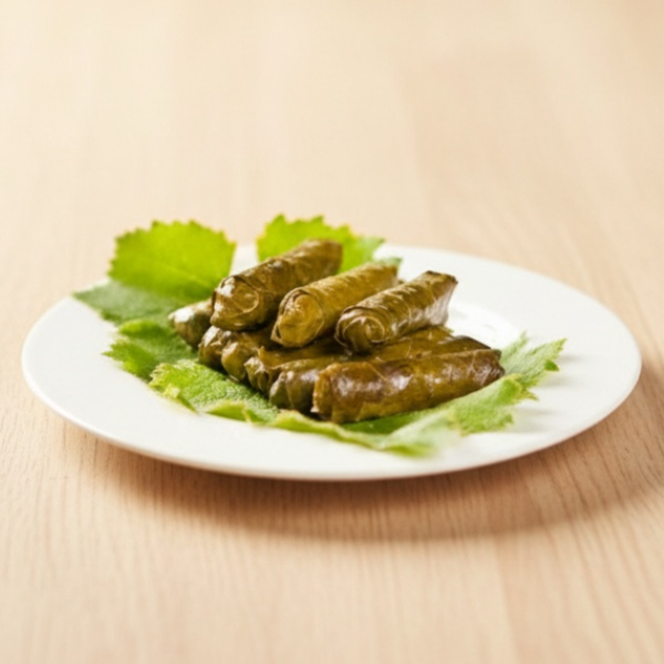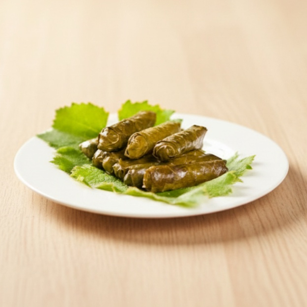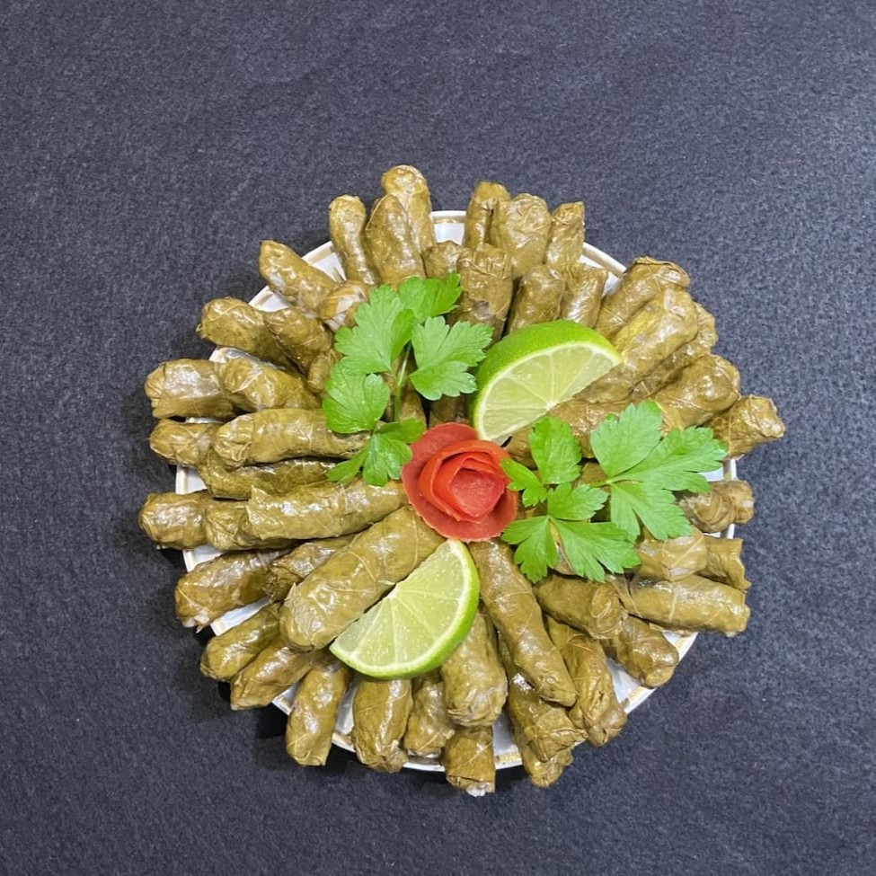 Folhas de uva enroladas em arroz, tomate, cebola, salsinha, hortelã e condimentos árabes. Porção de 250g