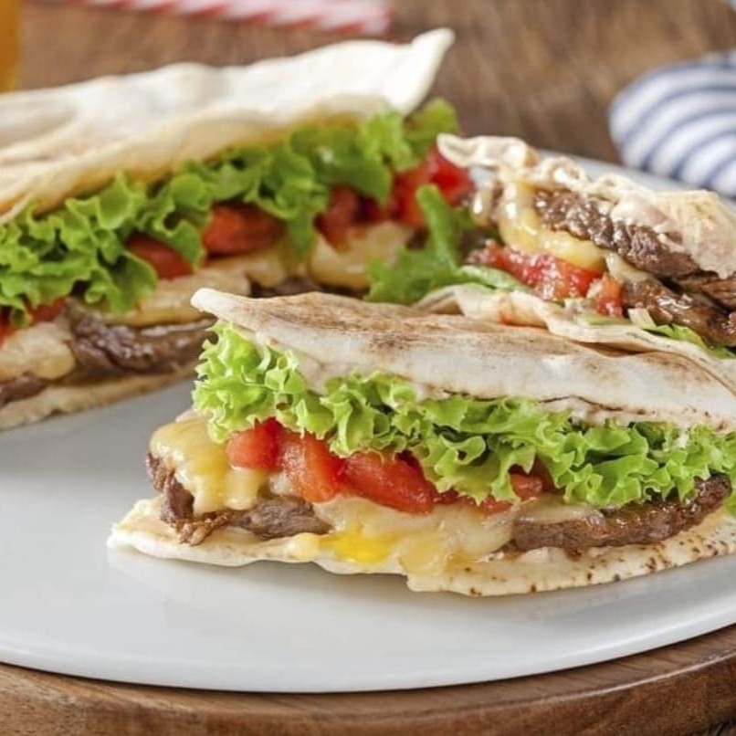 frango e carne em tiras temperado a moda arabe, alface, picles, tomate , mussarela e ovos no pão sirio. acompanha fritas