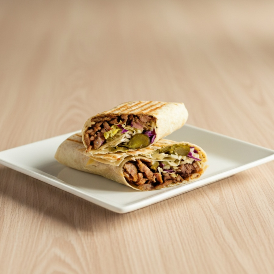 carne em tiras temperada a moda arabe co picles, cebola, molho de tahine e salsinha. Enrolado no pão sirio, acompanha fritas