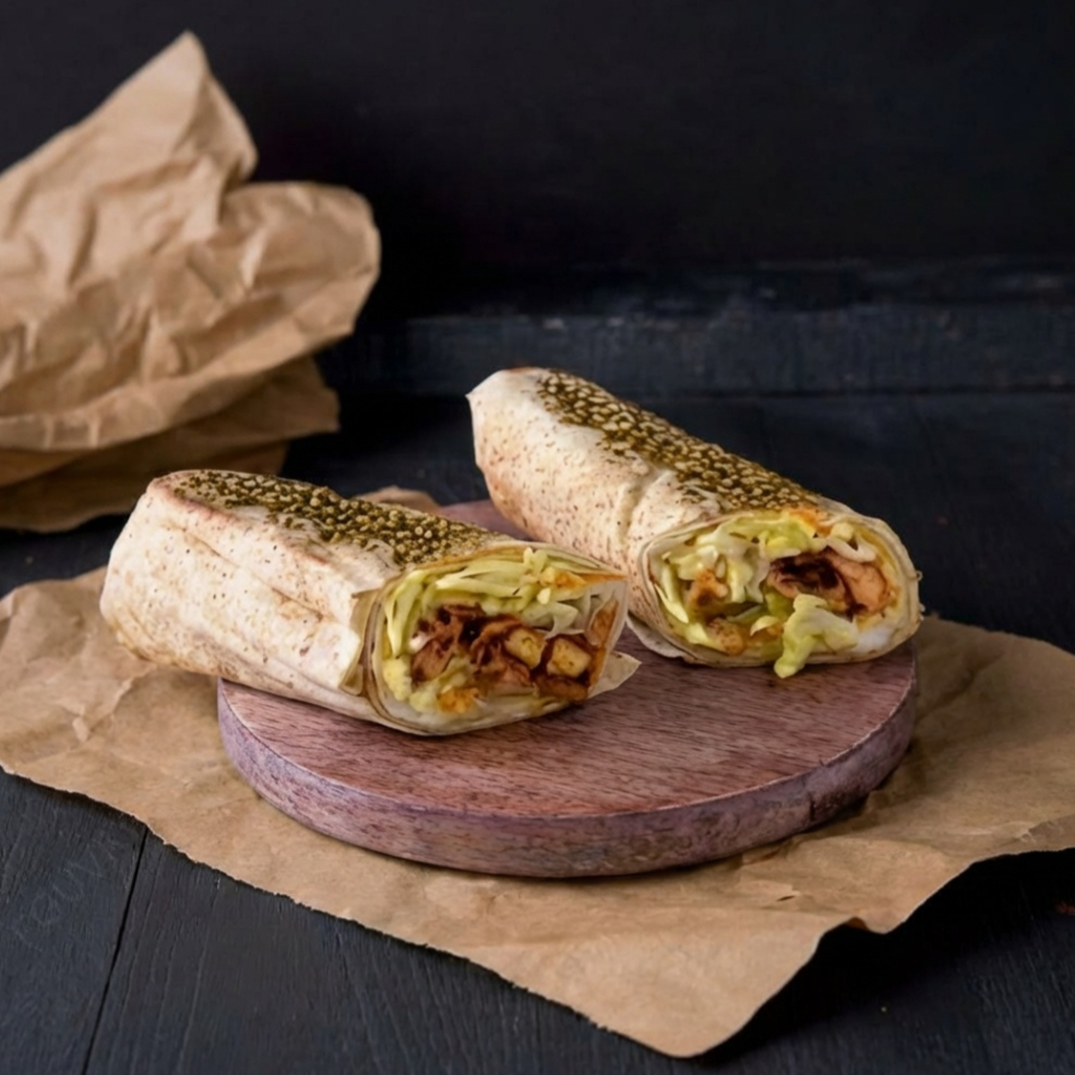 carne e frango em tiras temperado a moda arabe com picles, tomate, molho de alho, enrolado no pão sirio. Acompanha fritas