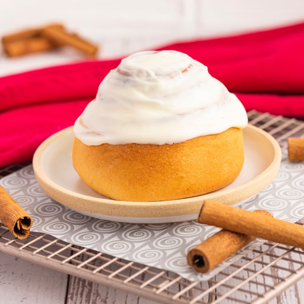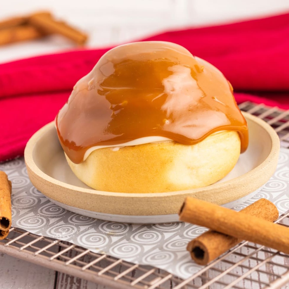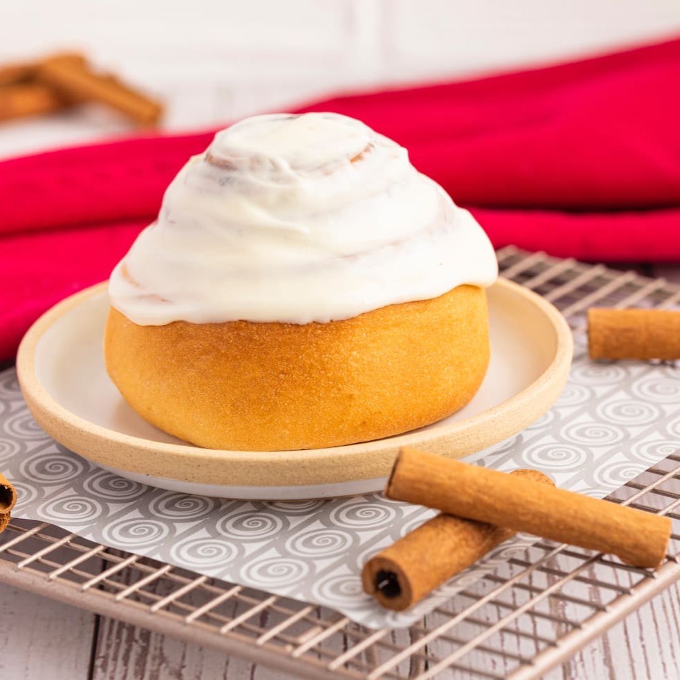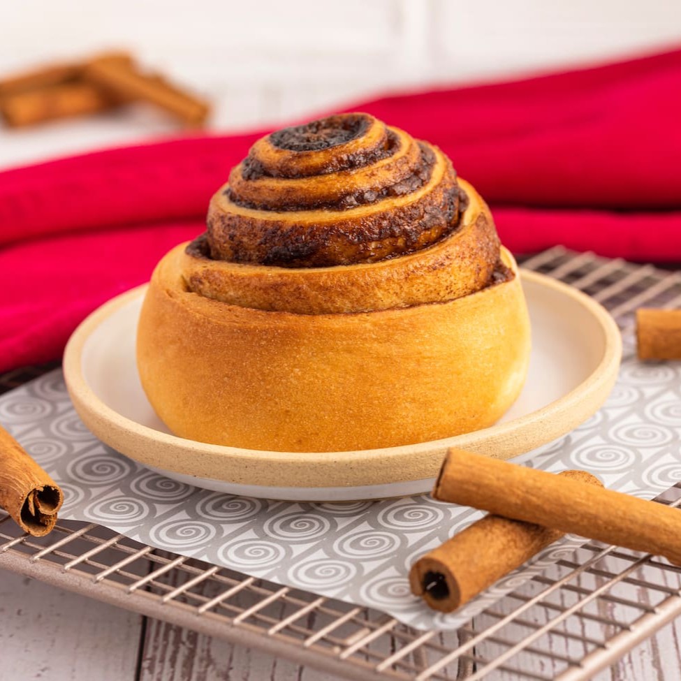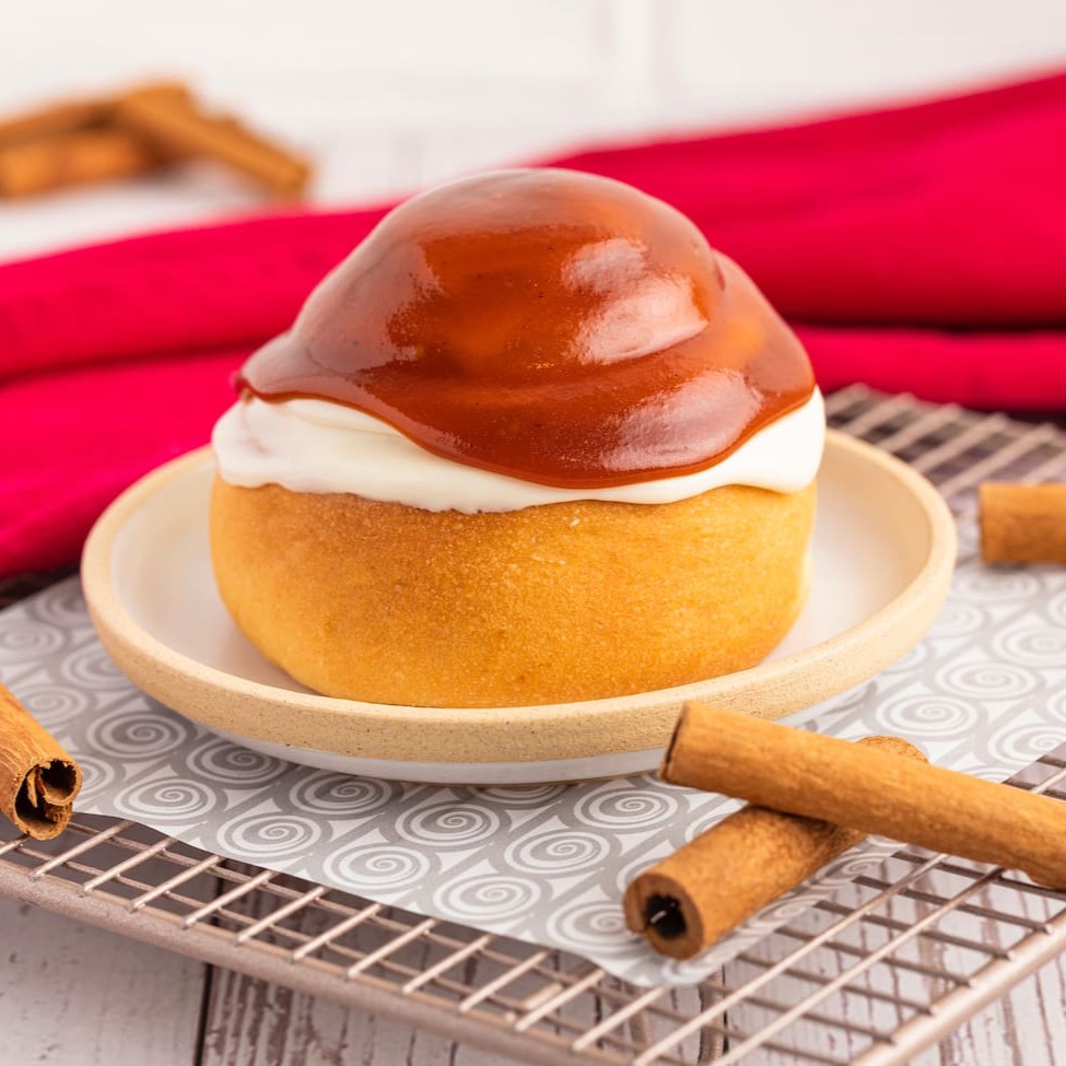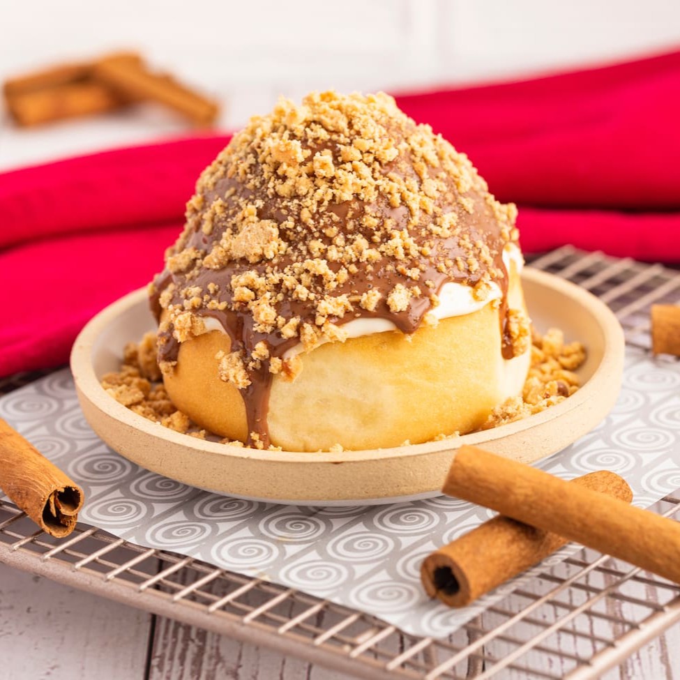 Cinnamon Roll fofinho, cobertura especial e 1 biscoito crocante de canela.