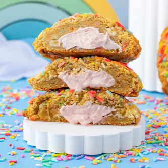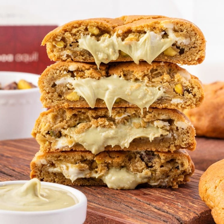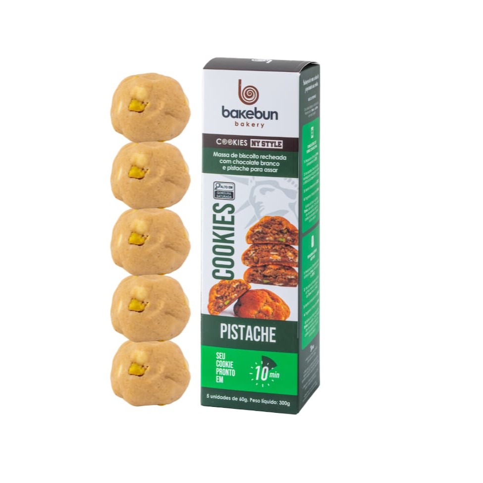 Massa tradicional, gotas de chocolate branco, pistache em grão e recheado com creme de pistache. Uma explosão de sabores: a crocância única do Cookie Ny Style de Pistache macio por dentro e irresistível. Cookies, cookie ou biscoito.