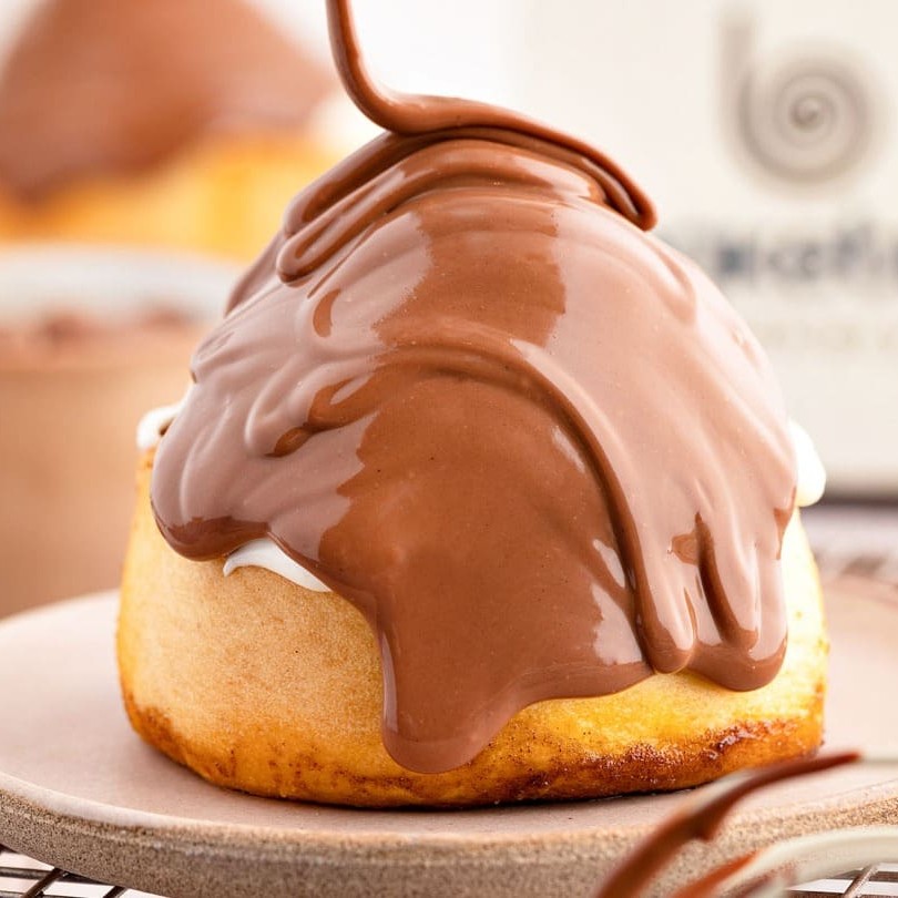 Roll como nunca se viu. Uma cobertura cremosa com aroma intenso, feito com chocolate Callebaut foi adicionada ao nosso bakebun cinnamon roll cobertura especial. Sinta a combinação entre o chocolate belga e a canela. Não é bolo, nem bolo no pote, mas é uma massa muito fofinha enrolada com açúcar mascavo, manteiga e canela.