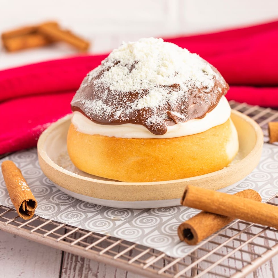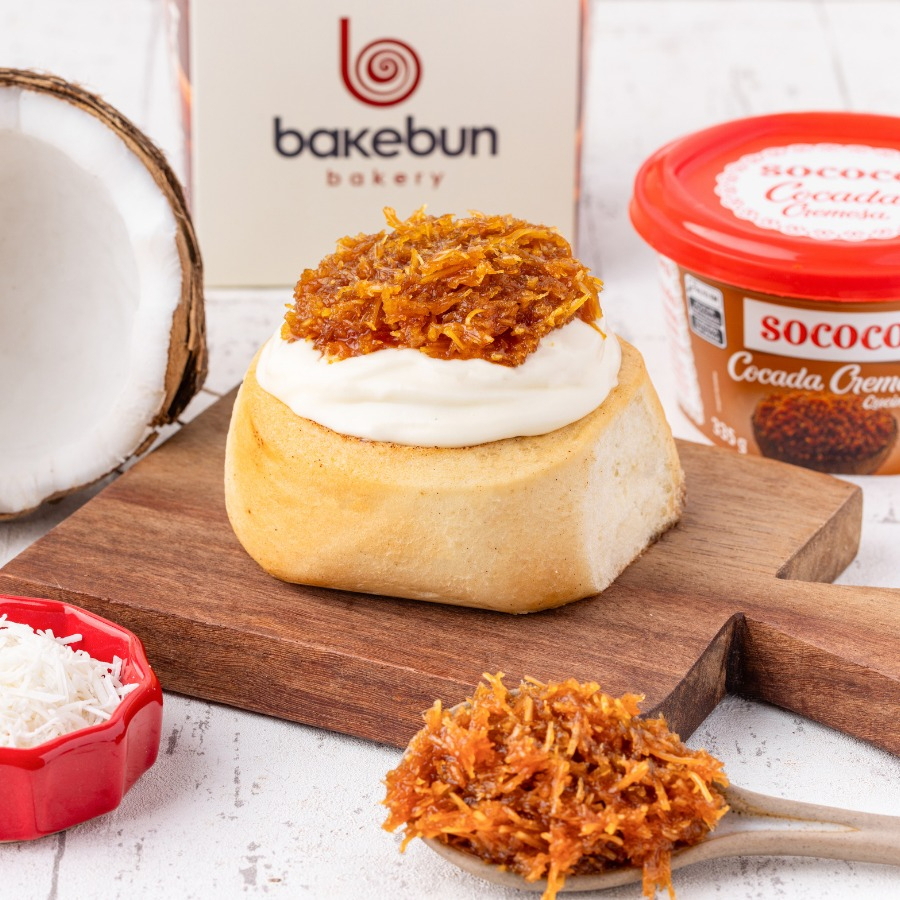 Cinnamon roll fofinho, cobertura especial e cocada queimada Sococo.