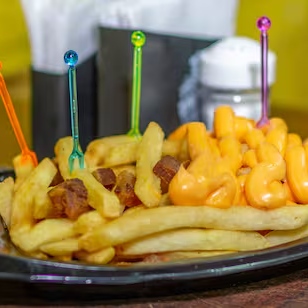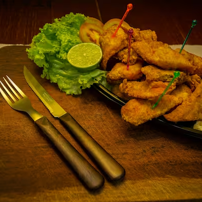 Batata frita, calabresa, vinagrete, farofa, carne de sol com mandioca, isca de frango, e molho tártaro.