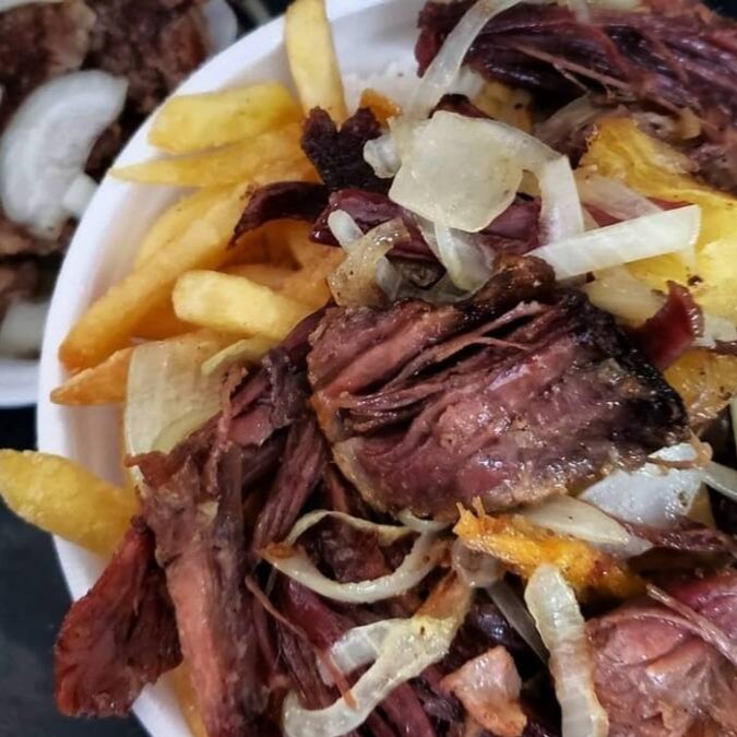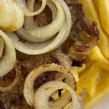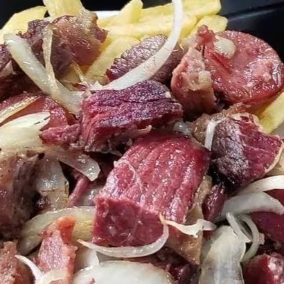 Picanha com cebola e manteiga, assada na chapa, cortada em tiras.